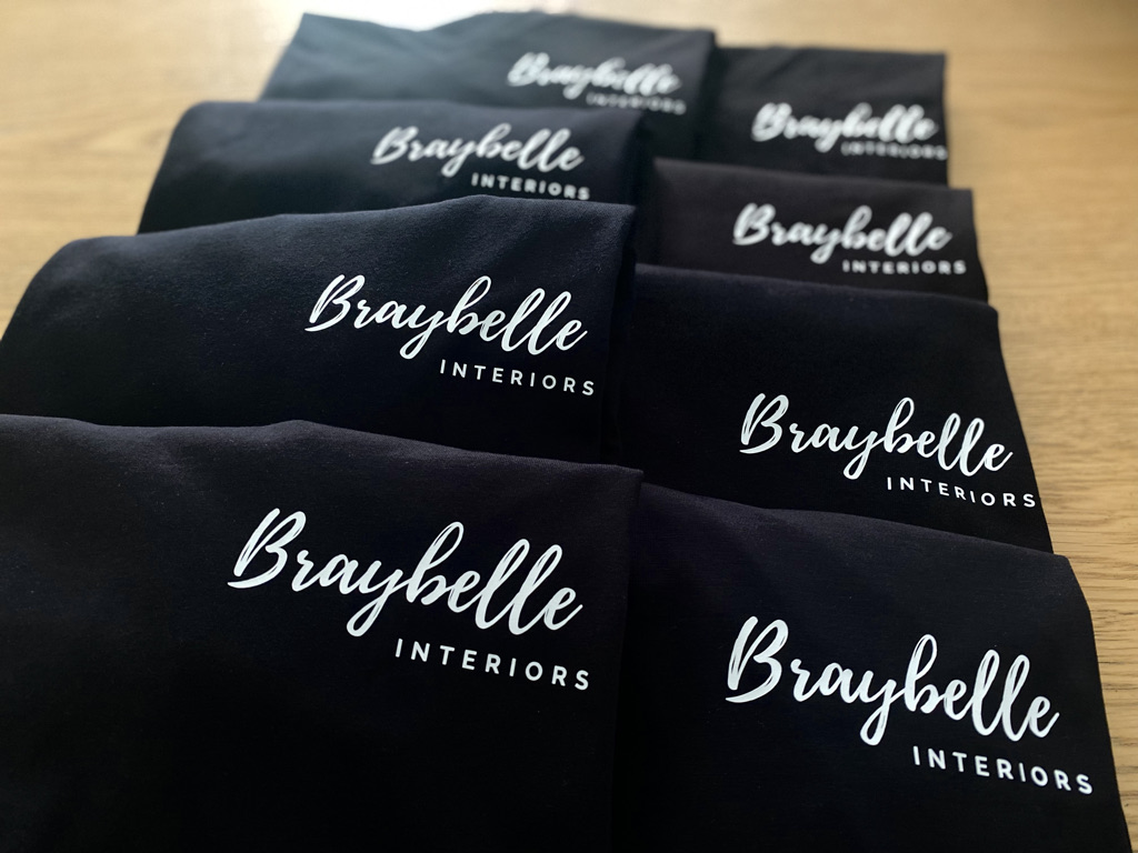 Print and press three T-shirts ‘Braybelle Interiors’ logo on front left